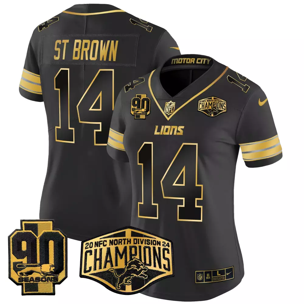 St. Brown Women’s Detroit Lions 2024 NFC North Champions Jersey | Black Alternate with Gold Trim | Stitched Limited Edition | For Men, Women & Youth;St. Brown Women’s Detroit Lions 2024 NFC North Division Champions Jersey | Black Gold with Patch | Stitched Limited Edition | For Men, Women & Youth;St. Brown Women’s Detroit Lions 2024 NFC North Division Champions Patch Gold Trim Vapor Limited Jersey | All Stitched Fan Gear | For Women & Youth;St. Brown Women’s Detroit Lions 2024 NFC North Division Champions Patch Vapor Limited Jersey | All Stitched Fan Gear | For Women & Youth;St. Brown Women’s Detroit Lions 2024 Vapor Limited Jersey | Black Alternate with Est. 1934 Patch | Stitched Fan Gear | For Men, Women & Youth