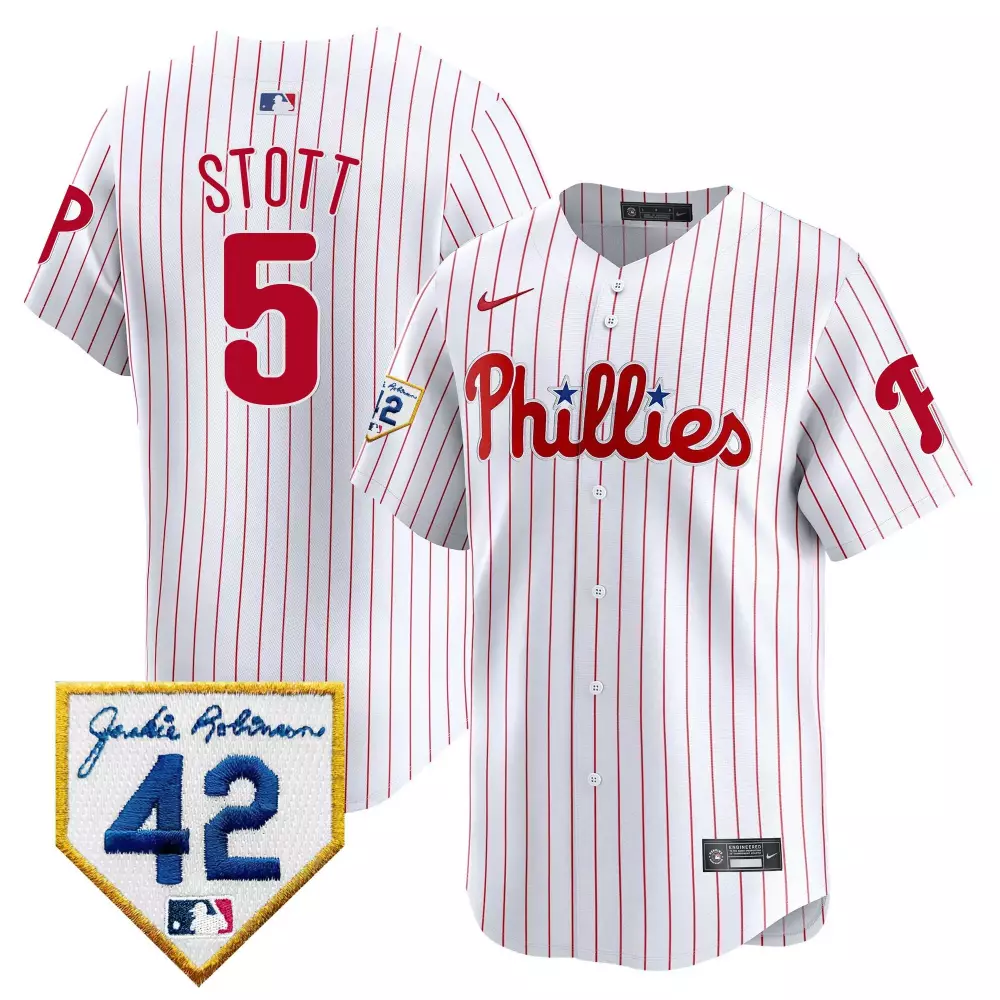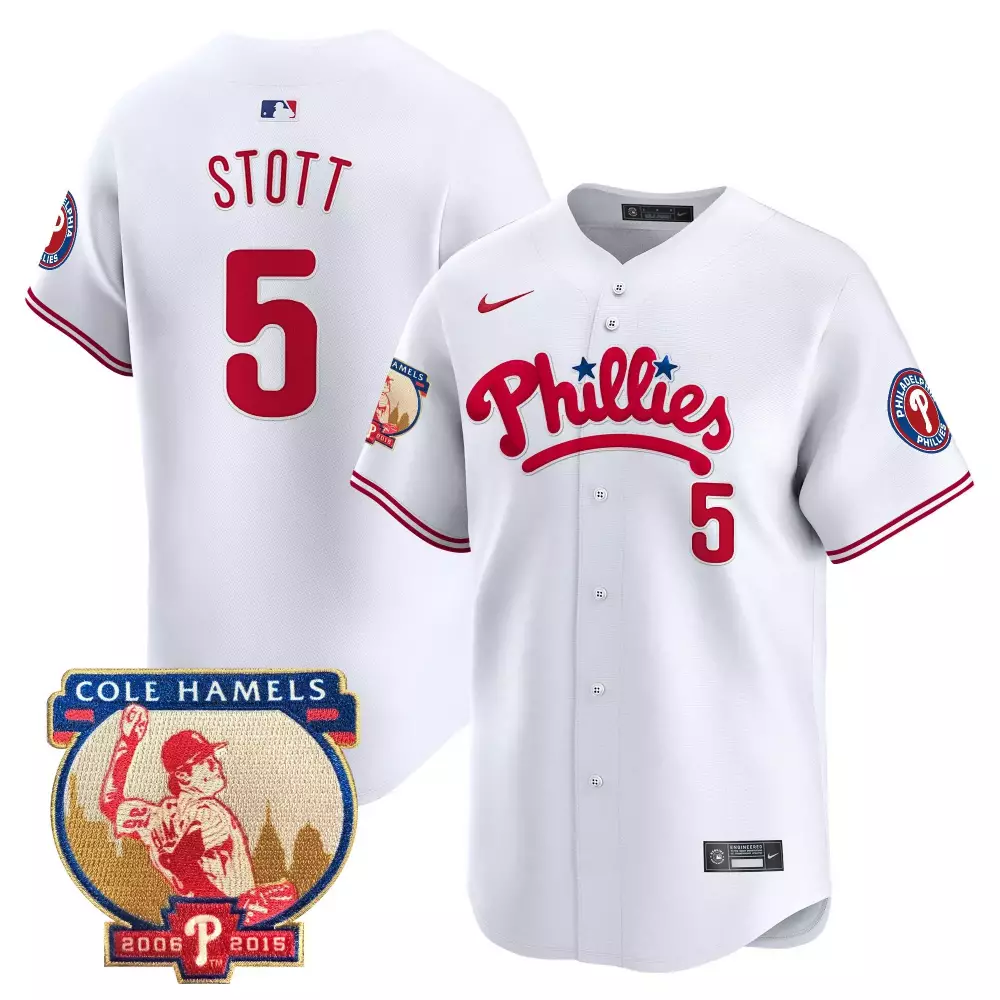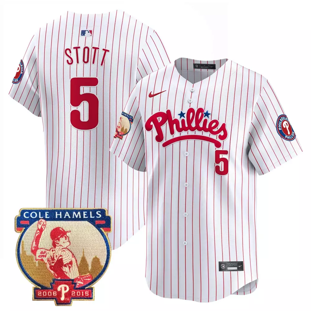 Stott 5 Philadelphia Phillies 2023 Stitched Vapor Jersey | White & Red Stripes | Limited Edition for Men, Women & Youth;Stott 5 Philadelphia Phillies 2023 Stitched Vapor Jersey | White & Red with Cole Hamels Patch | Fan Gear for Men, Women & Youth;Stott 5 Philadelphia Phillies 2023 Stitched Vapor Jersey | White & Red with Cole Hamels Patch | Unique Fan Gear for Men, Women & Youth;Stott 5 Philadelphia Phillies 2023 Stitched Vapor Jersey | White & Red with Jackie Robinson Patch | Fan Gear for Men, Women & Youth;Stott 5 Philadelphia Phillies 2023 Stitched Vapor Jersey | White & Red with NL Patch | Game Day Outfit for Men, Women & Youth