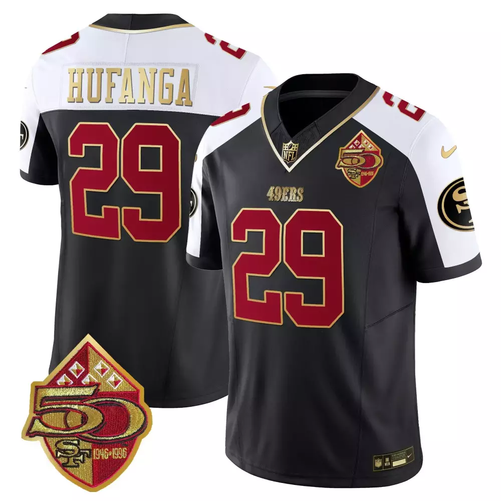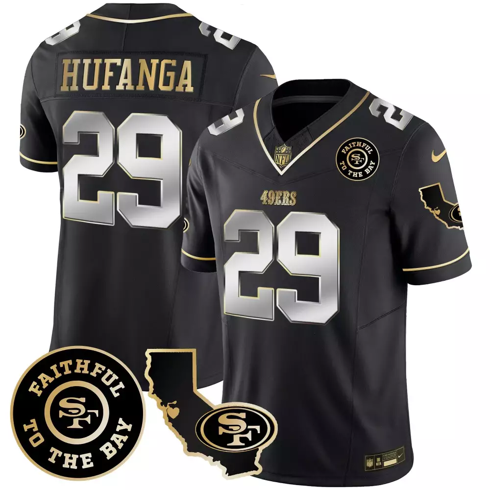 Talanoa Hufanga San Francisco 49ers 2023 Black Alternate Jersey | NFC West Champions Patch | Vapor Stitched Fan Gear | For Men, Women & Youth;Talanoa Hufanga San Francisco 49ers 50th Anniversary Black Alternate Jersey | Vapor Limited Edition | Stitched Fan Gear | For Men, Women & Youth;Talanoa Hufanga San Francisco 49ers Alternate Jersey | 2023 NFC West Champions Patch | Vapor Style for Men, Women & Youth;Talanoa Hufanga San Francisco 49ers Alternate Jersey | 50th Anniversary Patch | Limited Edition for Men, Women & Youth;Talanoa Hufanga San Francisco 49ers Black Jersey | Faithful California Patch | Vapor Style for Men, Women & Youth