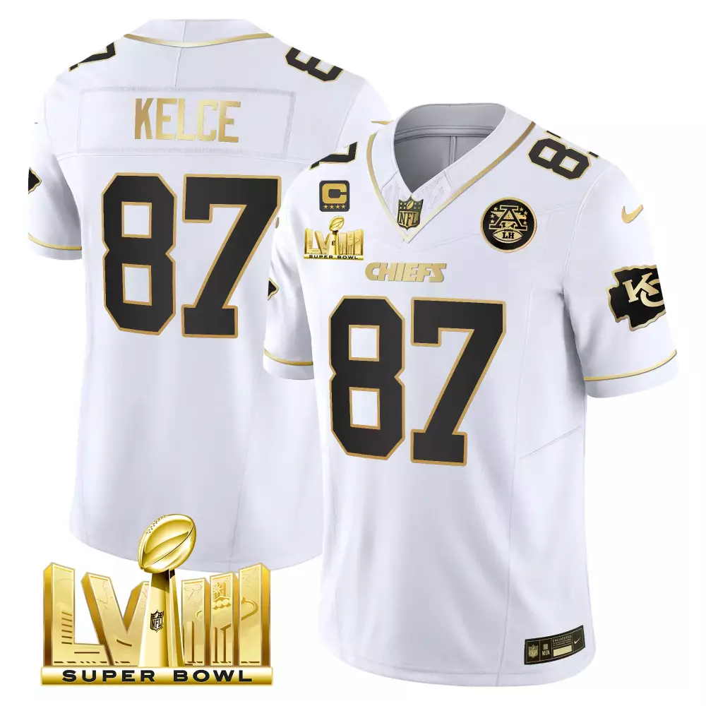Travis Kelce Kansas City Chiefs Super Bowl LVIII Gold Patch Vapor Jersey V4 | Stitched | Fan Gear for Men, Women & Youth;Travis Kelce Kansas City Chiefs Super Bowl LVIII Gold Patch Vapor Jersey V4 | Stitched Edition | For Women;Travis Kelce Kansas City Chiefs Super Bowl LVIII Gold Patch Vapor Jersey V4 | Stitched Fan Gear | For Men, Women & Youth;Travis Kelce Kansas City Chiefs Super Bowl LVIII Gold Patch Vapor Jersey V4 | Stitched Fan Gear | For Men, Women & Youth;Travis Kelce Kansas City Chiefs Super Bowl LVIII Gold Patch Vapor Jersey V4 | Stitched White & Gold | Limited Edition Fan Gear | For Men, Women & Youth