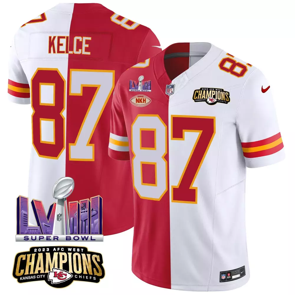 Travis Kelce Split Men’s Kansas City Chiefs Super Bowl LVIII Jersey | Stitched Gold Patch Vapor V2 | Limited Edition Fan Gear | For Men, Women & Youth