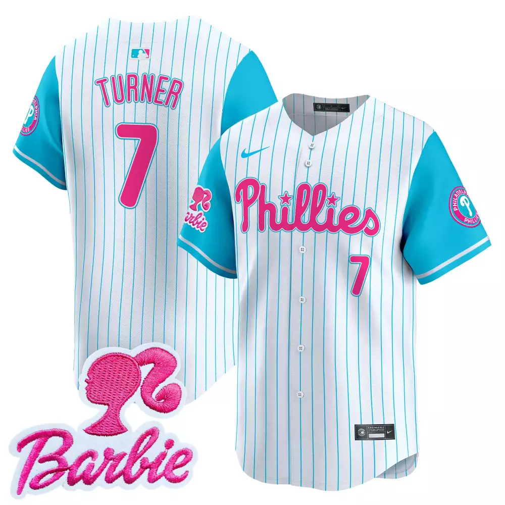 Trea Turner Philadelphia Phillies Unisex Pink Vapor Premier Limited Jersey | All Stitched | Stylish Fan Gear for Men, Women & Youth;Trea Turner Philadelphia Phillies Unisex Pinstripe Barbie Patch Vapor Premier Limited Jersey | All Stitched | Fan Gear for Men, Women & Youth;Trea Turner Philadelphia Phillies Unisex Pinstripe Bubblegum Pink Vapor Premier Limited Jersey V2 | All Stitched | Fan Gear for Men, Women & Youth;Trea Turner Philadelphia Phillies Unisex Purple Barbie Patch Vapor Premier Limited Jersey | All Stitched | Fan Gear for Men, Women & Youth;Trea Turner Philadelphia Phillies White Alternate Player Jersey | Stylish Fan Gear for Men, Women & Youth