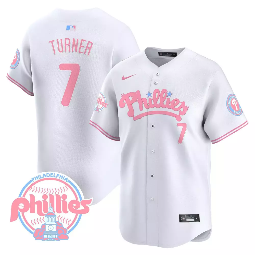 Turner 7 Philadelphia Phillies 2023 Stitched Vapor Jersey | White Pink Edition | Limited Edition Fan Gear | For Men, Women & Youth