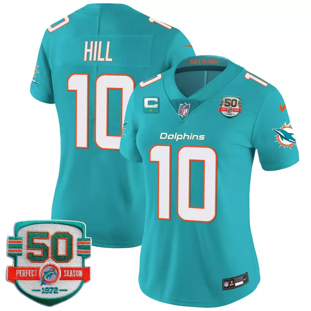 Tyreek Hill Aqua Miami Dolphins Baseball Teal Jersey | Stitched Replica Fan Gear for Men, Women & Youth | Stylish Game Day Outfit;Tyreek Hill Aqua Miami Dolphins Throwback 50th Season Vapor Jersey | Stitched Limited Edition Fan Gear for Men, Women & Youth;Tyreek Hill Aqua Miami Dolphins Vapor Limited Jersey | Stitched Fan Gear for Men, Women & Youth | Perfect for Game Day;Tyreek Hill Aqua Women’s Miami Dolphins 50th Season Patch Vapor Jersey | Stitched Limited Edition Fan Gear for Women & Youth;Tyreek Hill Aqua Women’s Miami Dolphins Gold Trim Vapor Jersey | Stitched Limited Edition Fan Gear for Women & Youth