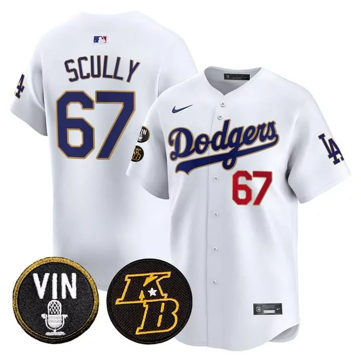 Vin Scully Dodgers Kobe Patch Gold Trim Vapor Premier Limited Jersey | Royal Style | Celebrate with Fan Gear | For Men, Women & Youth;Vin Scully Dodgers Kobe Patch Gold Trim Vapor Premier Limited Jersey | White | Fan Gear for Men, Women & Youth;Vin Scully Dodgers Leopard Mexico Vapor Premier Jersey | Limited Edition Printed Fan Gear | For Men, Women & Youth;Vin Scully Dodgers Mamba Jersey | Cool Base Style | Perfect for Game Day | For Men, Women & Youth;Vin Scully Dodgers Mexican Heritage Night Jersey | Red Style | Celebrate with Fan Gear | For Men, Women & Youth