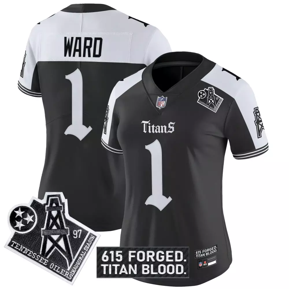 Ward 1 Tennessee Titans Women’s Navy Blue Vapor Jersey | 2023 NFL Edition Custom Design | For Women;Ward 1 Women’s Stitched Jersey | Tennessee Titans Black 2023 Edition with Name Patch | For Men, Women & Youth;Ward 1 Women’s Tennessee Titans Black Stitched Jersey | 2023 Edition with Name Patch | For Men, Women & Youth;Ward 1 Women’s Tennessee Titans Black Stitched Vapor Jersey | 2023 Edition with Embroidered Patch | For Men, Women & Youth;Ward 1 Women’s Tennessee Titans Vapor Jersey | Black with Embroidered Tennessee Oilers Patch 2023 | For Men, Women & Youth