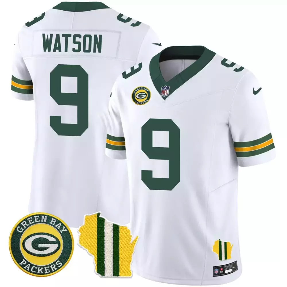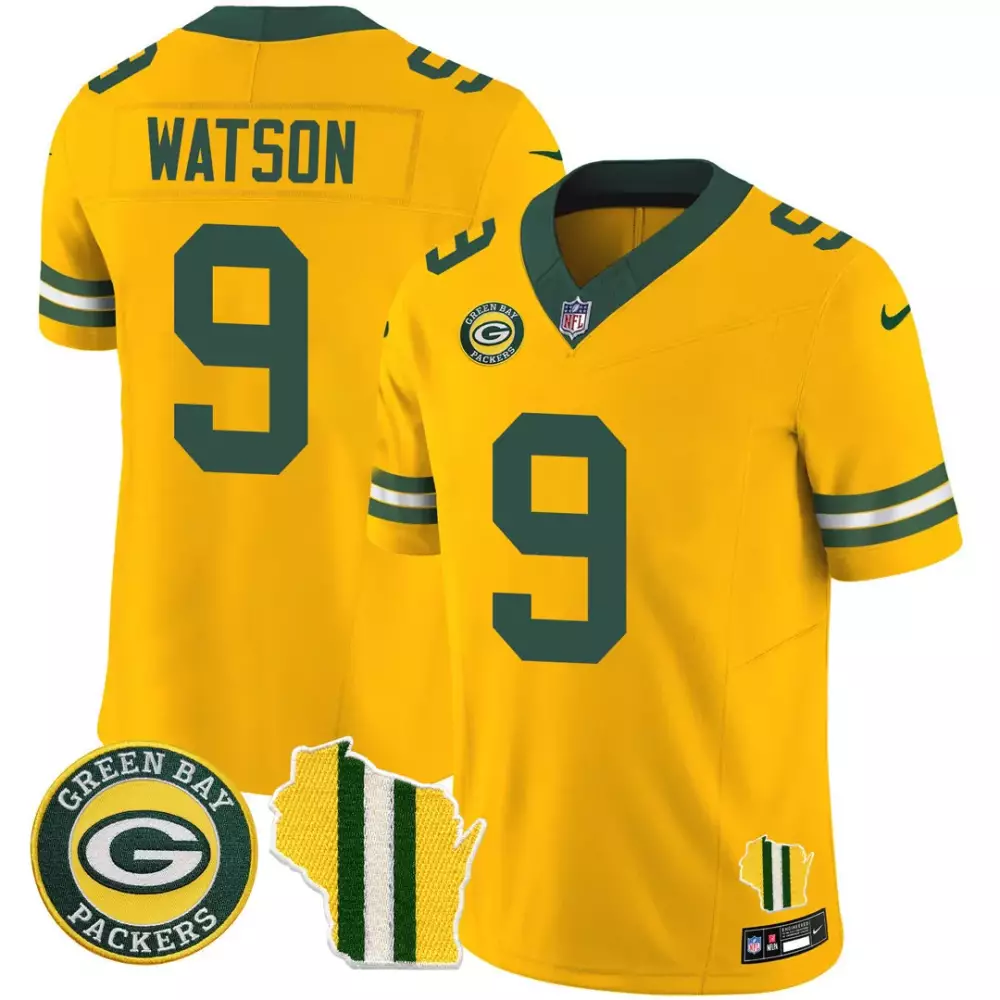 Watson 9 Green Bay Packers 2023 Stitched Jersey | Black Name Patch | Replica Fan Gear | For Men, Women & Youth;Watson 9 Green Bay Packers 2023 Stitched Vapor Jersey | White with Wisconsin Patch | Replica Fan Gear for Men, Women & Youth;Watson 9 Green Bay Packers 2023 Stitched Vapor Jersey | White, Green & Yellow | Game Day Outfit for Men, Women & Youth;Watson 9 Green Bay Packers 2023 Stitched Vapor Jersey | Yellow with Wisconsin Patch | Limited Edition Fan Gear for Men, Women & Youth;Watson 9 Green Bay Packers Black Stitched Jersey | Name Patch Est 1919 | Limited Edition Fan Gear for Men, Women & Youth