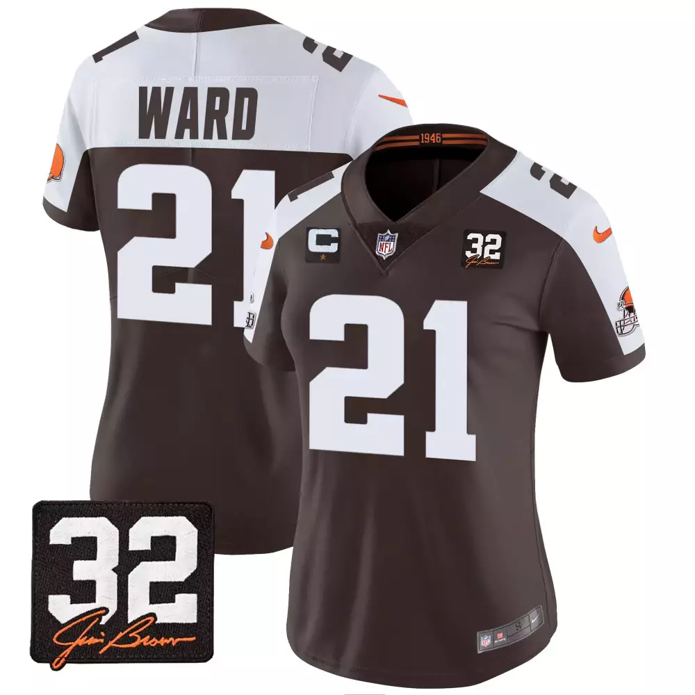 Women’s Ward 21 Cleveland Browns Home Jersey | Stitched Vapor Style | Fan Gear for Men, Women & Youth;Women’s Ward 21 Cleveland Browns Jersey | 2023 Stitched Vapor Style | Fan Gear for Men, Women & Youth;Women’s White Jersey Ward 21 Cleveland Browns 2023 | All Stitched Vapor Jersey with Memorial Patch | Limited Edition Fan Gear | For Women;Women’s White Jersey with Ward 21 Cleveland Browns 2023 | All Stitched Vapor Home Jersey | Limited Edition Fan Gear | For Women;Women’s White Vapor Jersey | Stitched Jim Brown 32 Cleveland Browns | Home Patch | For Women, Men & Youth