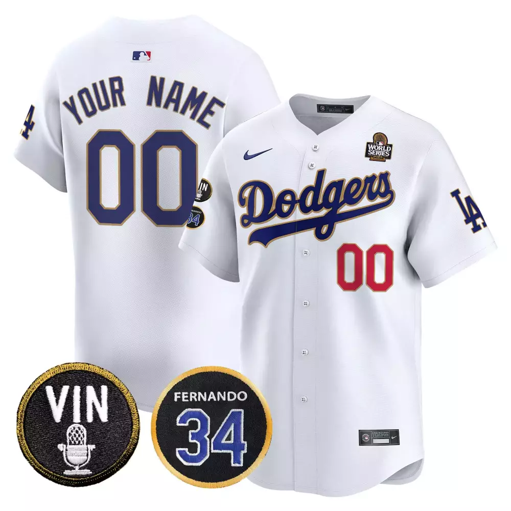 Youth White Dodgers 2024 World Series Gold Trim Vapor Premier Limited Custom Jersey V2 | All Stitched Fan Gear | For Men, Women & Youth;Youth White Dodgers 2024 World Series Gold Trim Vapor Premier Limited Custom Jersey V3 | All Stitched Fan Gear | For Men, Women & Youth;Youth White Dodgers 2024 World Series Vapor Premier Limited Custom Jersey | All Stitched Fan Gear | For Men, Women & Youth;Zoro 2 Dodgers 2025 Blue Stitched Vapor Jersey | One Piece Embroidered Patch Fan Gear for Men, Women & Youth;Zoro 2 Dodgers 2025 Red Vapor Jersey | Embroidered Patch Fan Gear for Men, Women & Youth
